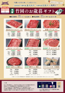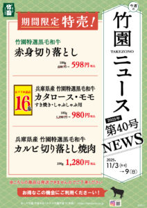 「黒毛和牛・国産豚」・・・・・牛肉は竹園特選黒毛和牛の端肉を、豚肉は国産にこだわっています。